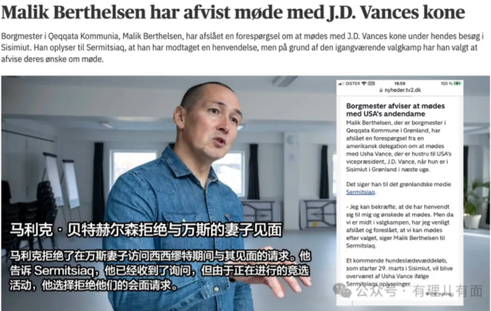 格陵兰自治政府理穆特·埃格德,甚至把美国第二夫人的到来视为“一种危险的挑衅”。格陵兰岛自治议会第一大党民主党主席则指责美国人的不能说话是对格陵兰人的不尊重。