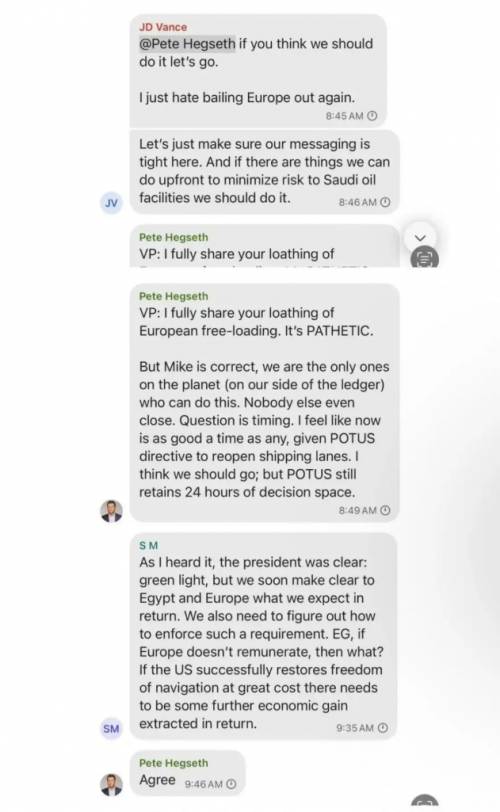 但是接着事情开始不对了,3月14日上午,这个群开始活跃了起来,副总统万斯和国防部长赫格塞思讨论是否对胡塞武装对红海航运的袭击作出回应。