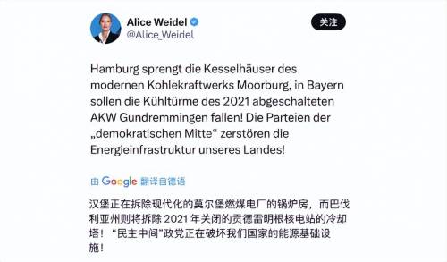 这件事中有值得推敲的细节,因为绿党对清洁能源这件事非常执着,一定要求关闭发电厂。德国刚胜选的基民盟主席默茨,对火力发电是持“开放态度”,表示上台之后可能会被重启。但就在这个关键节点上,投资几十亿欧元的发电厂被爆破了,默茨却没有发声。选择党领导人魏德尔在社交平台上怒斥:“汉堡正在拆除现代化的莫尔堡燃煤电厂的锅炉房,而巴伐利亚州则将拆除2021年关闭的贡德雷明根核电站的冷却塔!某些政党正在破坏我们国家的能源基础设施!”
