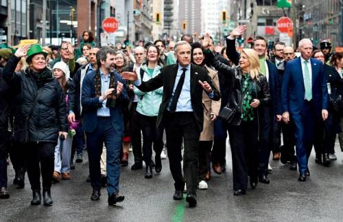 3月16日,加拿大蒙特利尔,加拿大新总理卡尼(中)参加圣帕特里克节游行活动。图/IC