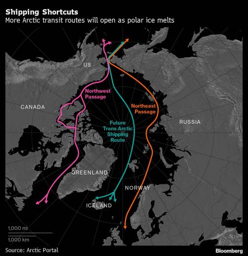 青色线为北极地区未来潜在可能开辟的、更短的航道。 彭博社制图