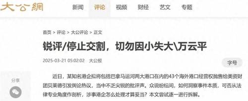 那么,李嘉诚家族做出这样的决策和操作,又是出于什么样的心态和目的呢?关于这个问题的答案,我们或许可以从此前香港本地的著名媒体《大公报》针对此事的锐评之中寻找答案。3月21日,《大公报》公开发文批评李嘉诚的所谓“港口交易”,这篇评论的内容大概之中有这样的字眼:商业决策若只求一己之私、漠视国家利益,那么无论其算计多精、利润多丰,与遭到国人唾弃、背负“卖国”骂名相比,孰轻孰重不言自明……奉劝有关企业和人士:停止交割,切勿打错算盘、因小失大。