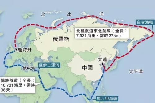 对于商业船只而言,选择北方海路运输货物,相较于走苏伊士运河,可缩短40%的里程,节省10到15天的时间。
