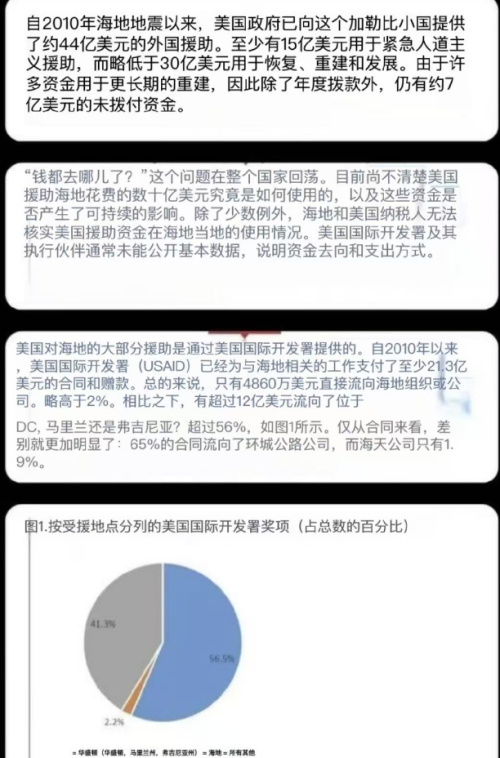 从美国国际开发署首次公布的文件来看,使用美国纳税人的钱(按百分比计算)的最大骗局是作为对海地的“援助”。在海地的40多亿美元中,只有2%到达了海地。其余的则流向了哥伦比亚特区的公司和“其他公司”。?“钱都去哪儿了?”这个问题在整个国家回荡。