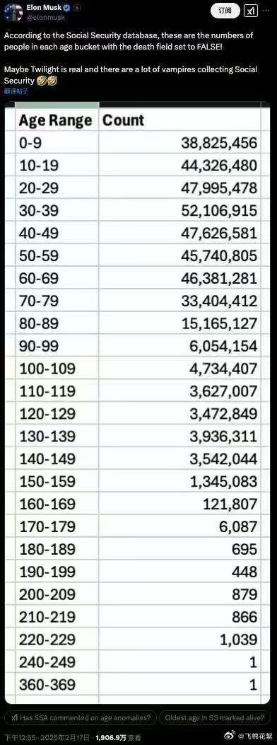领导美国政府效率部的埃隆·马斯克在社交媒体公布了一组美国社保数据库中,每个年龄段中“是否死亡”字段设置为否的人数数据。其中百岁以上老人超2000万,甚至有人年龄高达360岁。有网友指出,美国政府的官方数据显示,该国只有3.41亿人,但美国社保数据库却记录有3.98亿人登记社保。马斯克则回复道,这可能是“有史以来最大的欺诈”。