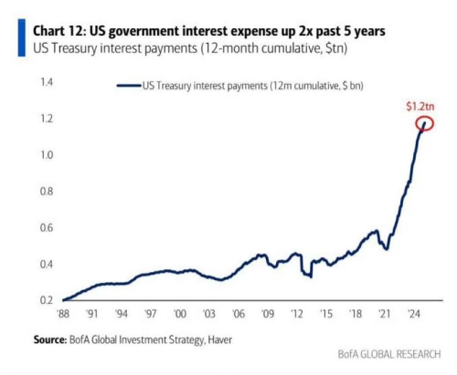 而进入深水区前,马斯克虽然做了很多动作,但是美国2025财年前5个月的财政赤字高达1.147万亿美元,这个财政赤字规模创新的历史记录,5个月的财政收入较去年同期增长2%,而财政支出则同比大增13%。财政支出中增长最大的就是国债利息,其未来12个月的国债利息支出将高达1.2万亿美元,这个都要怪拜登总统给埋的大雷。拜登留下的烂摊子和埋的雷确实十分恐怖。