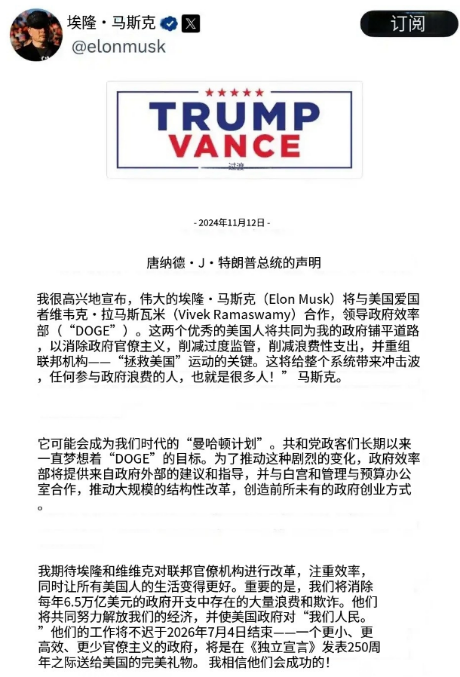 在马斯克担任美国效率部政府领导人时其表示,这将给整个系统带来冲击波,任何参与政府浪费的人都会受到影响。他相信,这场变革可能会成为我们这个时代的“曼哈顿计划”。