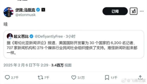 马斯克为一个火爆新闻点赞,据《哥伦比亚新闻评论》报道,美国国际开发署为30个国家的6,200 名记者、707家新闻机构和279个媒体行业民间社会组织提供了支持。难怪主流新闻听起来都一样。