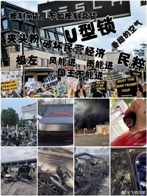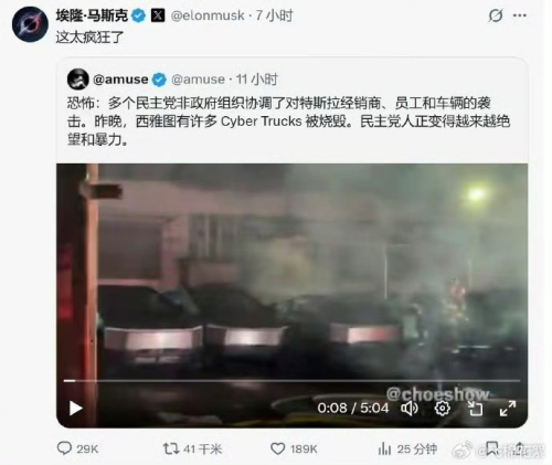 而马斯克在社交平台上连发多帖,指责针对特斯拉的一系列行为是“暴力恐怖主义”行径。“如此程度的暴力行为简直丧心病狂,而且大错特错。” 马斯克说:“来自左派的仇恨和暴力达到了如此高的程度,这让我非常震惊。我一直认为民主党人是有同情心,有爱心的,然而他们却在烧毁汽车,向特拉斯经销点投掷燃烧弹,捣毁特斯拉汽车。”马斯克说:“我认为这背后可能有更大的势力在起作用。我的意思是,谁在资助他们,谁在协调这种活动?因为这太疯狂了,我从来没见过这样的事情。”