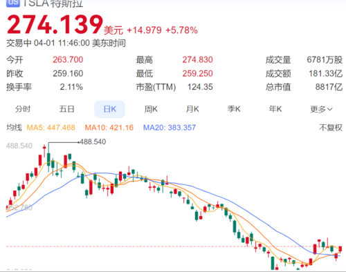 截至3月21日美股收盘,特斯拉股价报每股248.71美元,相较于去年12月488美元的高点“腰斩”。年初至今,该公司股票下跌了38.4%。据彭博亿万富翁指数(Bloomberg Billionaire Index),马斯克财富净值也随之缩水1130亿美元(约合人民币8191亿元)。马斯克在深夜召开了特斯拉全体员工大会。马斯克在大会上表示,尽管遇到了“艰难时刻”。在马斯克宣布从美国政府效率部离职后,特斯拉在2025年4月1日24点上涨5.8%到了274元。