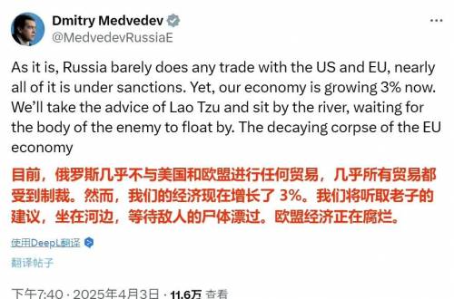 至于,俄罗斯人似乎对此颇为从容:梅德韦杰夫3日在社交上称,没有必要对美新关税大惊小怪,坐在河边静候敌人的尸体漂 ——那正是欧盟经济的腐朽尸骸。