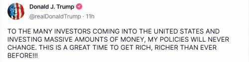 他写道,“对于众多来到美国并投入大量资金的投资者来说,我的政策永远不会改变。这是发大财、变得比以往任何时候都更富有的大好时机!!”