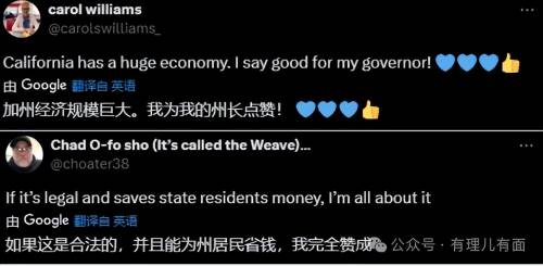 支持者狂刷“加州经济规模庞大,我为我的州长点赞!”“如果它是合法的,并且能为该州居民省钱,我完全赞成!”