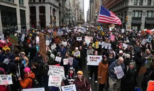 另外,报道提到,在欧洲的美国人也举行了示威,他们在柏林、法兰克福、巴黎和伦敦街头聚集,表明反对特朗普彻底改变美国国内外政策。