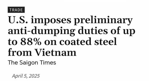 值得一提的是,越南第一个跪下,越南共产党领导人苏林在4月5日致特朗普的一封信中,提出取消所有对美国进口商品的关税,但特朗普顾问却表示:远远不够。给越南来个反倾销,钢的税率直接从40%升到88%。
