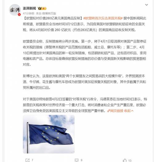 2024年,欧盟对美出口额在3656亿美元左右,中国对美出口额为5246.56亿美元,如果中欧对美加征“对等关税”,美国一半进口商品将价格暴增,你一旦真把供应链断了,别人不围你转了,开始反击,那美国金融霸权也就没地儿立了。美国民众还将承受多出的关税成本。欧盟现在站到了中国一边,趋势越来越明显,只要全世界正义力量团结在一起形成反特朗普统一战线,特朗普的暴政离破灭就不远了。