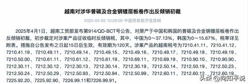 根据中国贸易救济信息网披露的文件,4月初越南工贸部已经对外发布公告,称将对从中国进口的合金钢镀层板征收最高37.13%的反倾销税。