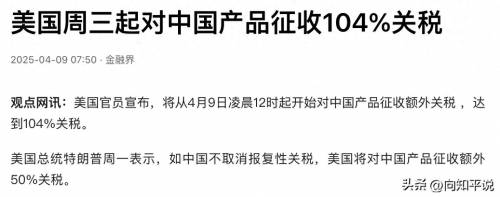 4月9日特朗普对中国下的最后通牒时间已到,因为中国迟迟未能在4月8日最后期限低头让步,根据国内媒体报道,美国白宫官员已经证实将对中国全部产品再次加码征收50%关税,总计104%。