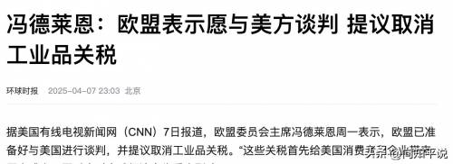 本以为欧盟会跟我们站一边、学着中国强势出击,但欧委会主席蒙德莱恩最近又改口了,她称欧盟已经准备好跟美国坐在谈判桌上,甚至愿意提前示好,对美国进口的工业品施行零关税。