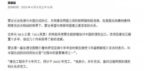 从另一个角度来看,如果澳大利亚等煤炭出口国在特朗普政府的威逼利诱下,卷入对中国的关税战,那么对于中国而言,煤炭进口方面就可能面临潜在的风险。而此时,蒙古如果解决了跨境运输的问题,其煤矿就能够在一定程度上成为澳煤的替代。这对于中国来说,无疑是一种有备无患的策略,能够帮助中国解决一个隐藏的后顾之忧。