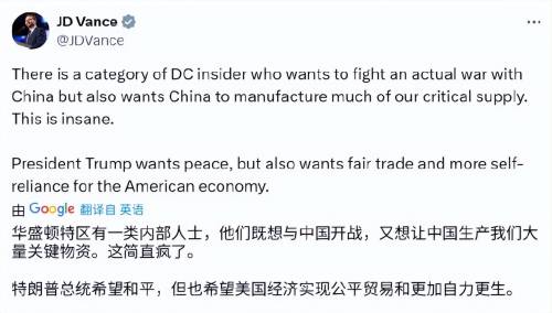 美国副总统万斯在社交媒体上发言,也在一定程度上证明了这一点。万斯称:在华盛顿领导层里,有一群人即想和中国开战,又不想和中国经济脱钩,简直疯了。但特朗普总统不一样,他期望和平,并希望美国能够实现公平贸易和自力更生。