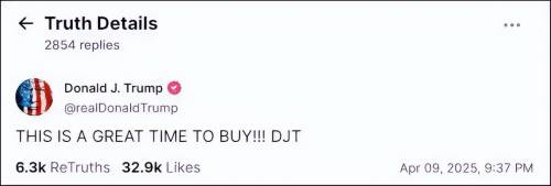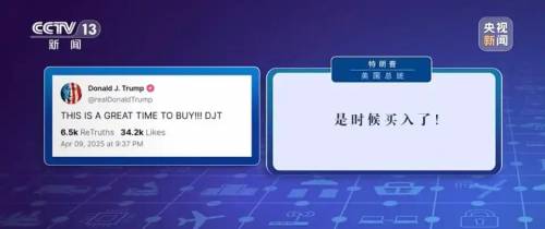 然而,戏剧性的转折发生在4月9日,当天上午9时37分,特朗普突然在其创立的社交平台上发布帖文“这是买入的好时机!!!”,并在结尾处标注了“DJT”。