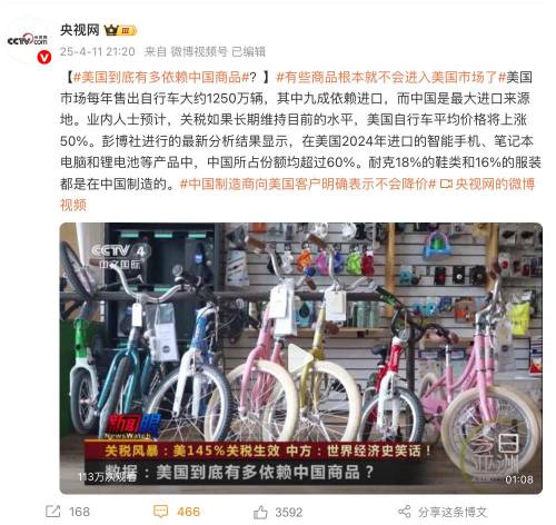 另外,美国市场每年售出自行车大约1250万辆,其中九成依赖进口,而中国是最大进口来源地。业内人士预计,关税如果长期维持目前的水平,美国自行车平均价格将上涨50%。