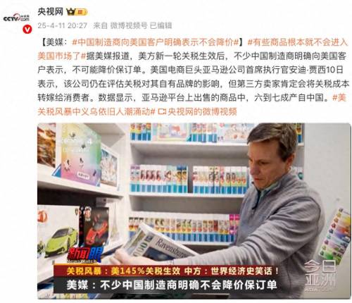 据@央视网4月11日报道,据美媒报道,美方新一轮关税生效后,不少中国制造商明确向美国客户表示,不可能降价保订单。美国电商巨头亚马逊公司首席执行官安迪·贾西10日表示,该公司仍在评估关税对其自有品牌的影响,但第三方卖家肯定会将关税成本转嫁给消费者。数据显示,亚马逊平台上出售的商品中,六到七成产自中国。
