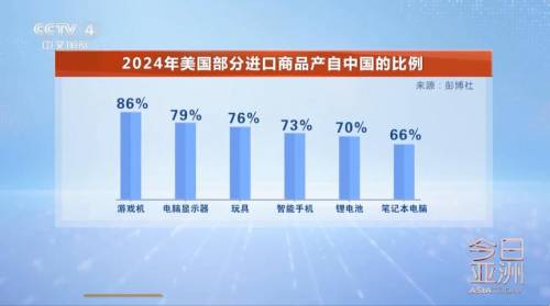 彭博社进行的最新分析结果显示,在美国2024年进口的智能手机、笔记本电脑和锂电池等产品中,中国所占份额均超过60%。耐克18%的鞋类和16%的服装都是在中国制造的。