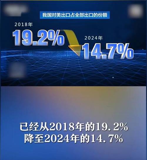 根据数据统计,在2018年时我国对美国出口还占总出口的19.2%,而到了2024年已经降至到14.7%了。