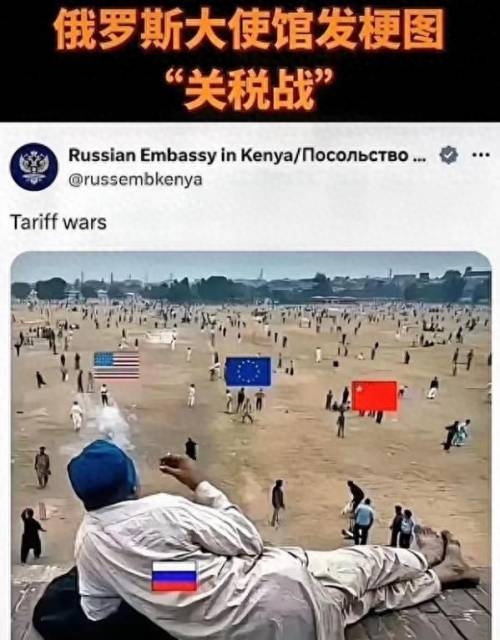 对于中美关税大战,俄罗斯的反应一直都很奇怪。比如在特朗普宣战全球时,俄罗斯的一个驻外大使馆,就发布了一个“坐山观虎斗”的图片,以此表达俄罗斯是心情。