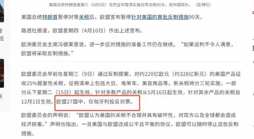 国际社会对特朗普的关税政策普遍持批评态度,这为我国召集联合国会议创造了有利条件,欧盟方面,欧盟27个成员国中有26国投票支持对美国特定产品征收关税,仅匈牙利投了反对票。