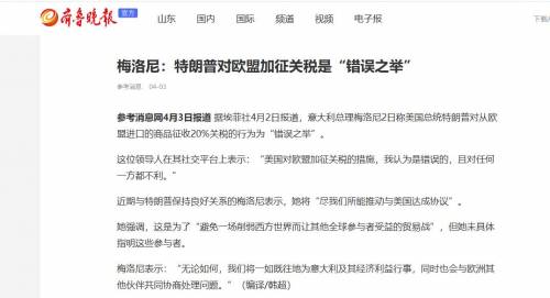 意大利总理梅洛尼表示,美国对欧盟征收的20%关税是“错误的”,但欧盟应该努力避免贸易战,她强调:"关税是错误的,不符合任何一方的利益。我们将尽一切努力与美国达成协议,目的是避免贸易战,否则将不可避免地削弱西方,有利于其他全球参与者"。