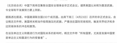 据多家媒体报道,我国计划于下周三(23日)在联合国举行一场特别会议,公开谴责美国激进的关税政策,并已向所有193个联合国成员国发出邀请。