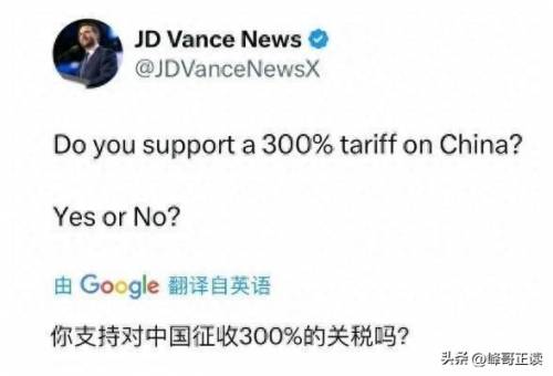 在4月12日,当特朗普偷偷对大批中国商品豁免关税时,万斯却在网上发文表示,要将对中国的关税提高到300%!