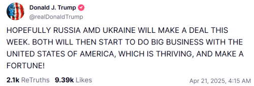“希望俄罗斯和乌克兰本周能达成协议。然后双方都开始和蓬勃发展的美国做大生意,并大赚一笔!”特朗普当日在“真实社交”平台写道。