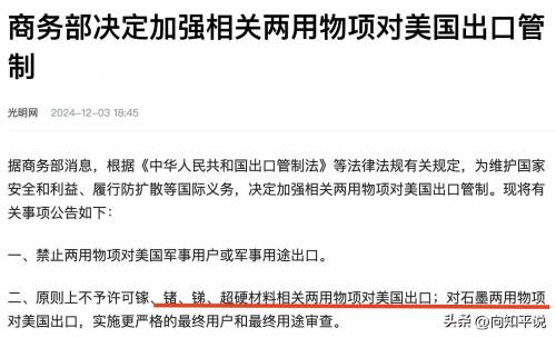 2024年12月,中方决定加强对美两用物项的管控力度,公告中就提到了镓、锗、锑和超硬材料两用物项,以及石墨两用物项。