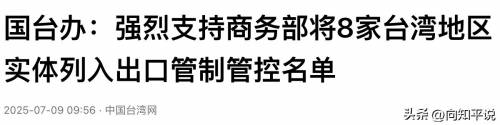 7月9日,中国出口管制法和两用物项出口管制条例强势出击,直接回击台湾地区日前来回横跳的行为。一共有8家实体公司从当日起,立刻被切断从大陆进口两用物项的任何渠道,哪怕是正在进出口的活动,也必须立刻停止。