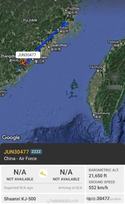 对我们来说,口头上的警告是一方面,实际的反制行动也是另外一方面。最近就有人发现,在ADSB公开数据上,中国空军有一架KJ-500预警机披露了部分在福建海岸上空飞行的数据。内容显示,这架KJ-500在当天的飞行中以大约6600米的高度,以550千米每小时的速度持续飞行。