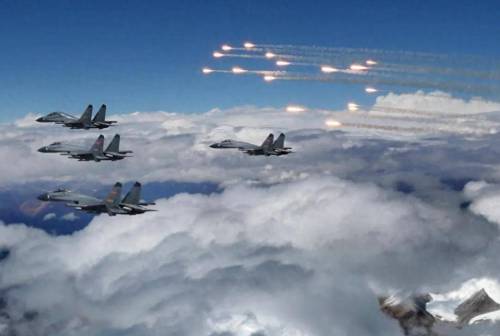 58架战斗机在台海附近破空而出,挂满导弹,有序的进行海上巡航,压迫感十足!