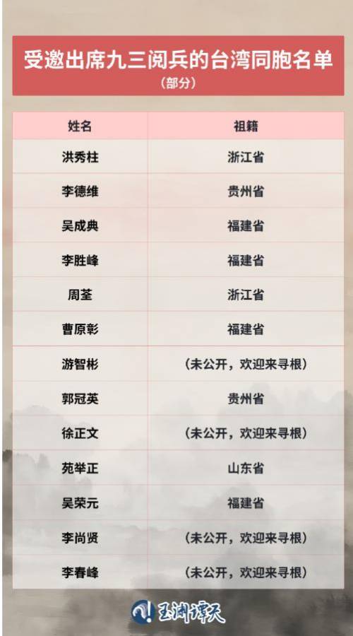 央视旗下的账号“玉渊谭天”在阅兵仪式结束后,公布了一份“受邀出席九三阅兵台湾同胞名单”,其中包括国民党前主席洪秀柱,国民党“中央委员”李德维、新党主席吴成典等人。