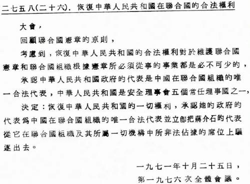 9月30日中国外交部发布了《中方关于联大第2758号决议的立场文件》。文件指出,联大第2758号决议郑重确认、充分体现了一个中国原则。一个中国原则的基本涵义有三层,即世界上只有一个中国,台湾是中国领土不可分割的一部分,中华人民共和国政府是代表全中国的唯一合法政府。