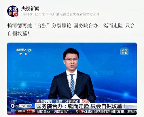 国台办发言人陈斌华次日严词痛斥:“赖清德的分裂谬论充斥敌意对抗,其‘行动方案’就是穷兵黩武的‘毁台方案’,‘台独’意味着战争,胆敢突破红线必迎头痛击!”