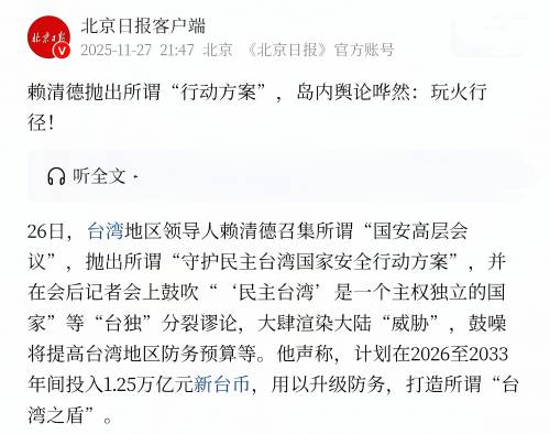 11月26日,赖清德召集所谓“国安高层会议”抛出“守护民主台湾国家安全行动方案”,公然鼓吹“‘民主台湾’是主权独立国家”,鼓噪8年间投入1.25万亿元新台币升级防务,其“以武谋独”的野心昭然若揭。