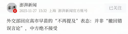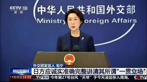 近日,日本政府外交部门称日本对中国的立场从未改变,坚持“一贯立场”,对于这个“一贯立场”,外交部发言人毛宁回应“什么一贯立场讲清楚”,讲不清楚就等于模糊立场,讲了也等于白讲(大概意思,笔者注)。而关于日本政府昨日对高市早苗涉台错误言论的表态“不再提及”,外交部发言人郭嘉昆表示“不提及”和“撤回”是两码事,性质完全不同。