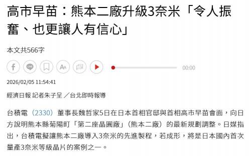 就在2月5号,台积电董事长魏哲家在东京跟日本首相高市早苗见了面。紧接着,台积电一纸新闻稿直接把岛内炸开了锅:原本规划给日本熊本二厂的制程,居然要直接升级到3纳米。