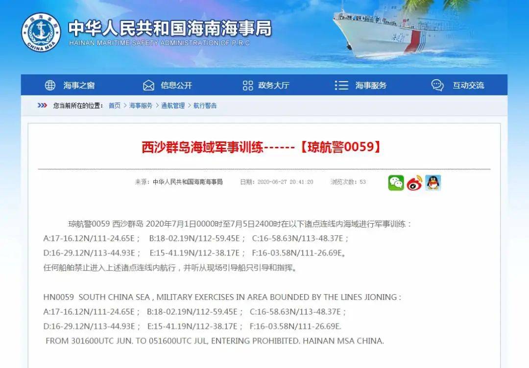 根据海南海事局官方网站发布的最新消息,7月1日至5日,西沙群岛海域将执行全域禁航,区域内将有军事演练。从划定的范围来看,几乎囊括了包括三沙市在内的西沙群岛所有岛屿,而此次军演消息一出来就得到各方关注,不仅仅是我军在西沙军演的意义,而且很多人也与其他事件相互联系起来了。