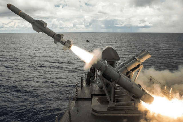 2017年8月22日,美国海军第七舰队在关岛演练,图为发射鱼叉反舰导弹