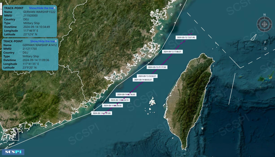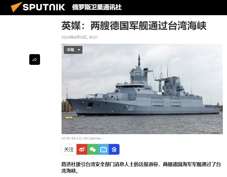 9月13日,离开韩国港口的德国海军“巴登符腾堡”号护卫舰和“美因河畔法兰克福”号补给舰编队,一路南下并穿越台湾海峡。当天,德国防长皮斯托利乌斯以及台防务部门的通报,均证实了这一消息。