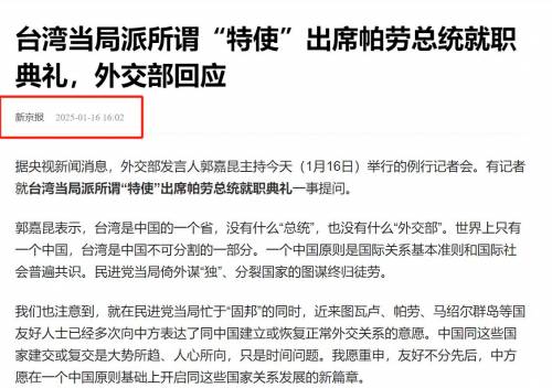 (信源:新京报2025年1月16日—台湾当局派所谓“特使”出席帕劳总统就职典礼,外交部回应)